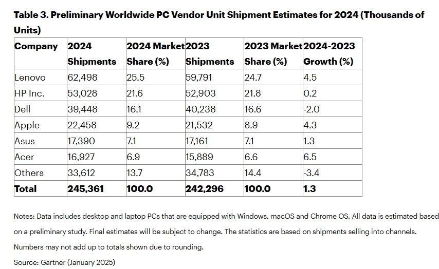 另一家市場分析公司Gartner的最新報告顯示,2024年第四季度全球PC出貨量總計6440萬臺,較2023年第四季度增長1.4%——這是出貨量連續第五個季度持續增長;2024年全年PC出貨量達到2.453億臺,較2023年增長1.3%,意味著全球PC市場的復蘇仍在持續。